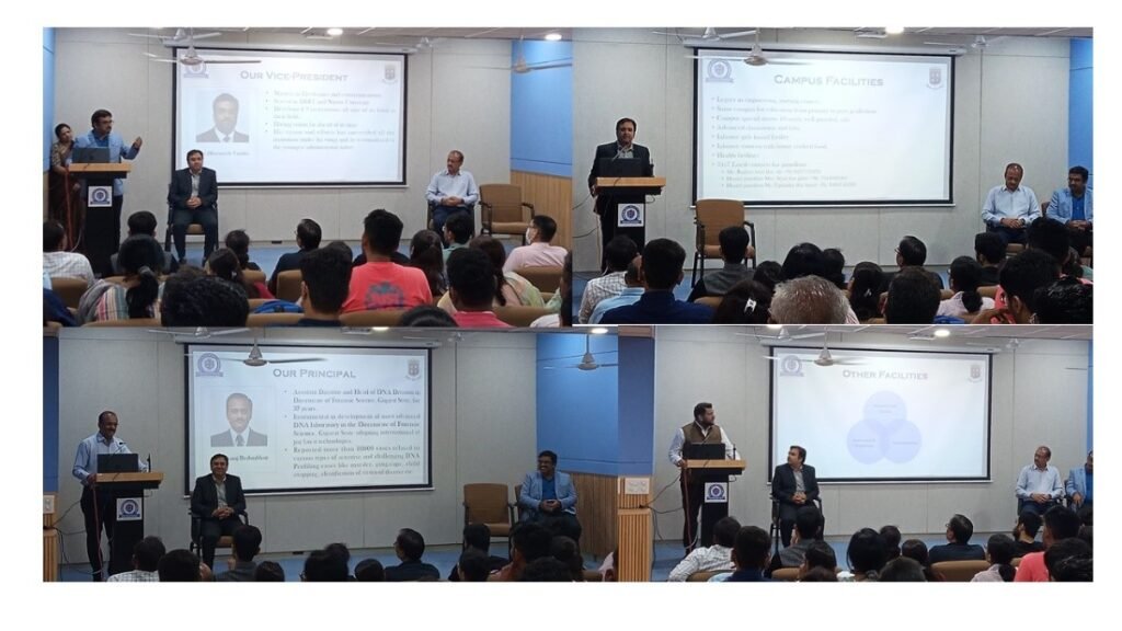 She welcomed the Vice President sir Prof. Dharmesh Vandra. Prof. Dharmesh sir introduced the students and the parents to the spiritual legacy of the institute, the aim and the scope of NSIT and its perspective programmes. Followed by him,   the Principal – Prof. (Dr.) Nikunj Brahmbhatt was welcomed to address. Dr. Nikunj sir shared the importance of studying forensic courses and how it can be implied on to the Criminal Justice System to give justice. The Campus Director Prof. Sanjay Sharma sir oriented about the infrastructure and various facilities like different laboratories, canteen, hostel facilities, health care facilities that are available in the campus for students. Then Dr. Parvesh Sharma, course coordinator of M.Sc. Cyber Security was invited to brief about the other facilities such as student loan facilities, internships & placements and local transportation along with different routes to approach airport and the nearby railway station.