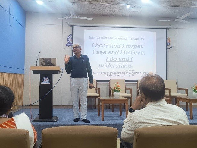 Mr. Ashish Shah, a Certified Financial Planner, conducted an insightful session on “Financial Literacy.” He discussed the importance of financial planning, how to make smart investment decisions, and how faculty members can manage their finances to secure their future. The session covered key financial tools, such as mutual funds, insurance, retirement planning, and tax-saving options. The session was highly interactive, with Mr. Shah addressing queries from the faculty about personal finance, creating wealth, and preparing for financial emergencies. Participants left with a better understanding of how to manage their money effectively.