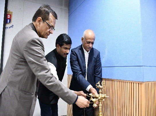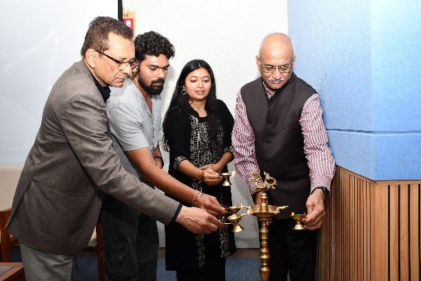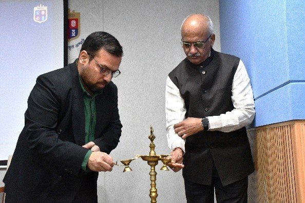 The program began with the ceremonial lighting of the lamp, led by Mr. Hemanth Sai Reddy and Principal Prof. Dr. Nikunj Brahmbhatt.
