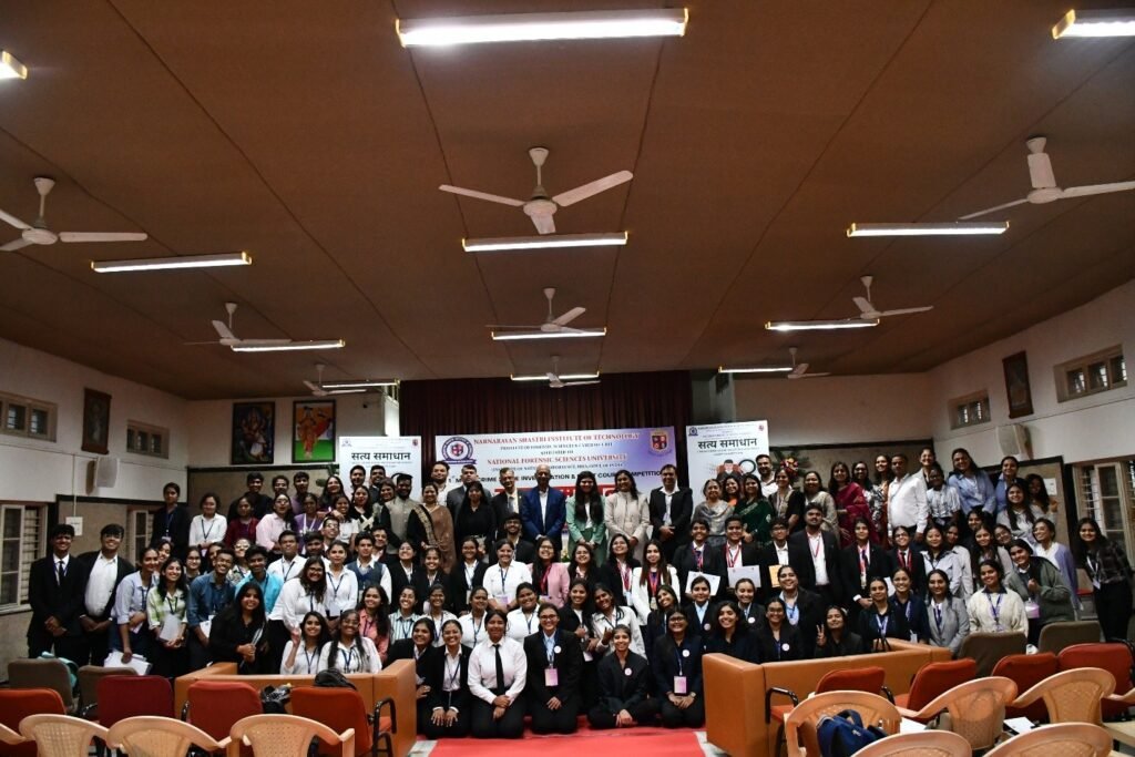 The Satya Samadhan – 1st Moot Court and Crime Scene Investigation Competition was successfully conducted on 10th January 2025 at NSIT-IFSCS, Jetalpur, Ahmedabad. The event aimed to provide students with a practical platform to showcase their forensic investigation and legal advocacy skills. Participants from universities across India took part, making it a truly competitive and intellectually stimulating event. The event witnessed the presence of Shri PP Swamiji, Managing Trustee of Narnarayan Shastri Institute of Technology, Mr. Dharmesh Vandra, Vice President of NSIT-IFSCS, Prof. (Dr.) Nikunj Brahmbhatt, Principal of NSIT-IFSCS, Prof. K.V Ravikumar, Director-Training and Consultancy NSIT-IFSCS and Esteemed faculty members from NSIT-IFSCS. The student along with the guidance of the faculty members, created 10 Mock Crime Scene in the campus which included various mock cases relating to Murder, Suicide by hanging, Document Forgeries, Vehicle accident, Poisoning, Murder followed by Corpse mutilation, Black Magic, Rape & Murder etc. which was used for the competition purpose.